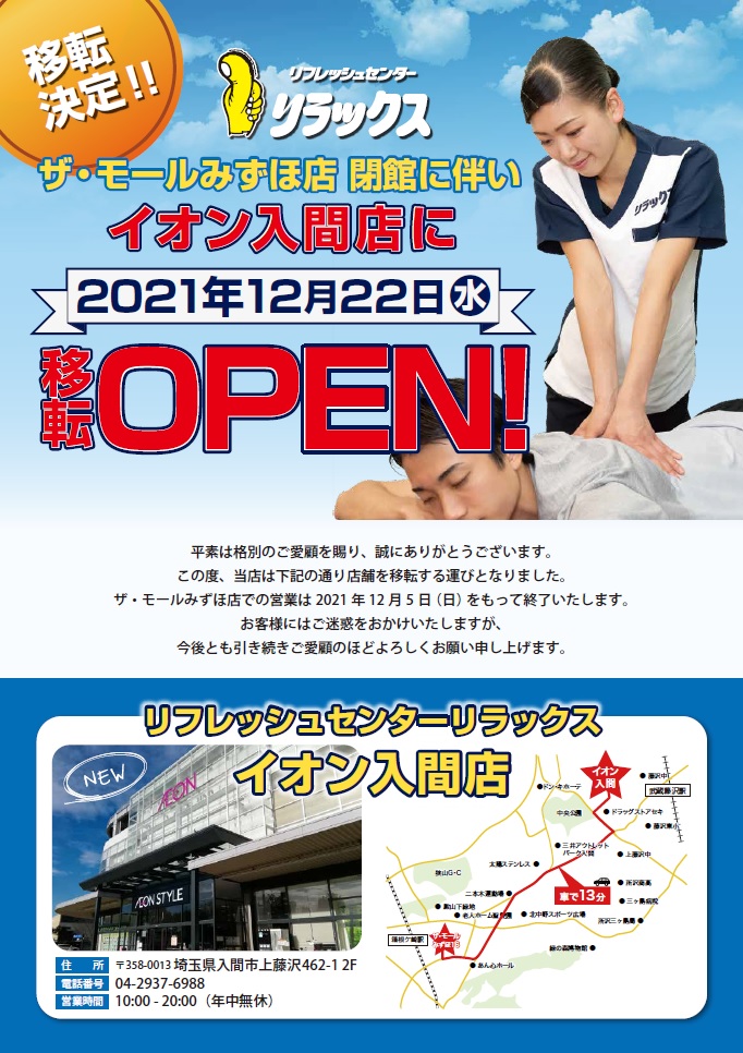 いつもリフレッシュセンターリラックス ザ・モールみずほ店をご愛顧いただき誠にありがとうございます。