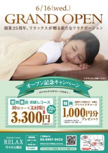 遂にワンランク上のリラックスがオープンします。 コースメニューもこれまでと異なります。 是非一度お試しくださいませ。